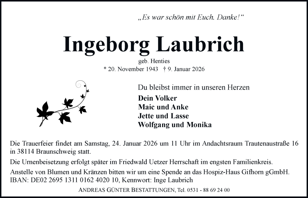 Hier finden Sie alle Traueranzeigen aus der Zeitung, die bisher für Ingeborg Laubrich erschienen sind. Weitere Traueranzeigen, die in der Zeitung erscheinen, werden hier ebenfalls aufgelistet