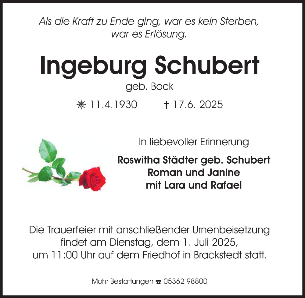 Hier finden Sie alle Traueranzeigen aus der Zeitung, die bisher für Ingeburg Schubert erschienen sind. Weitere Traueranzeigen, die in der Zeitung erscheinen, werden hier ebenfalls aufgelistet