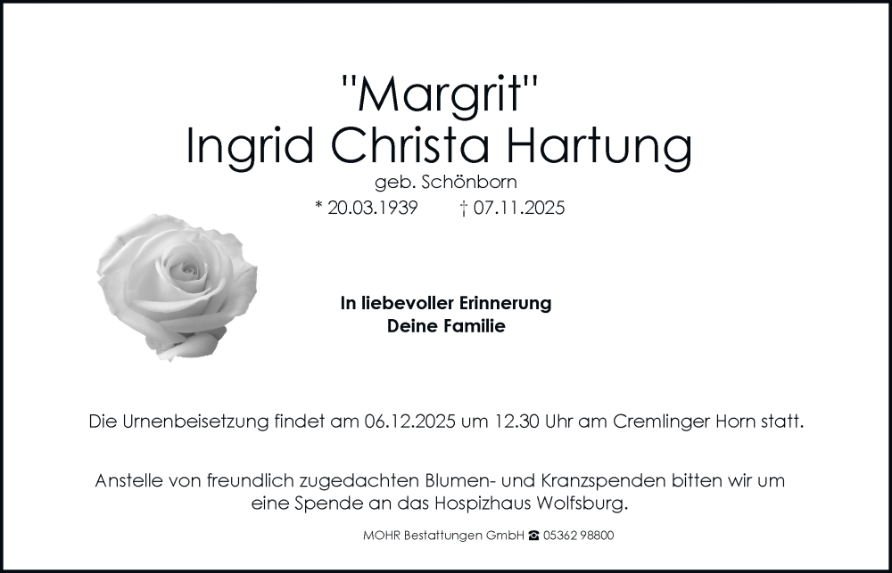 Hier finden Sie alle Traueranzeigen aus der Zeitung, die bisher für Ingrid Christa Hartung erschienen sind. Weitere Traueranzeigen, die in der Zeitung erscheinen, werden hier ebenfalls aufgelistet