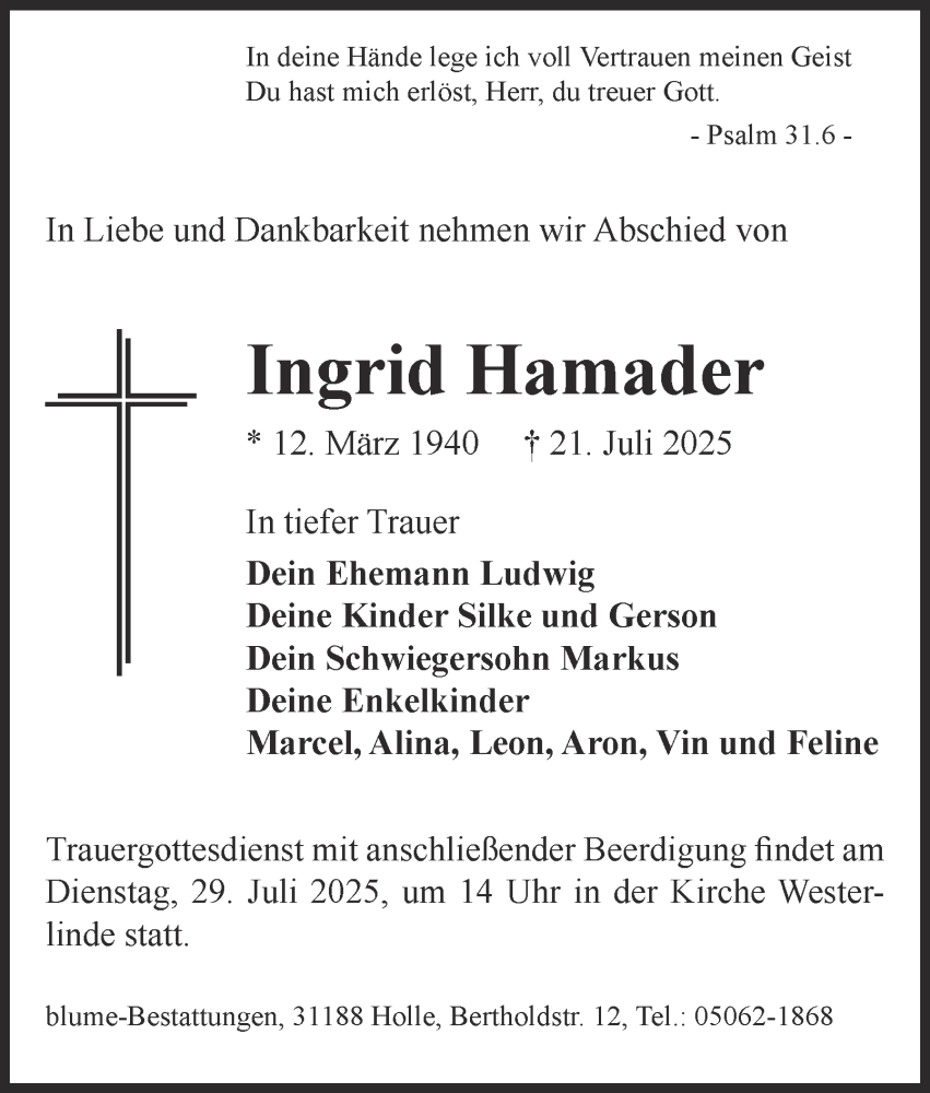 Hier finden Sie alle Traueranzeigen aus der Zeitung, die bisher für Ingrid Hamader erschienen sind. Weitere Traueranzeigen, die in der Zeitung erscheinen, werden hier ebenfalls aufgelistet