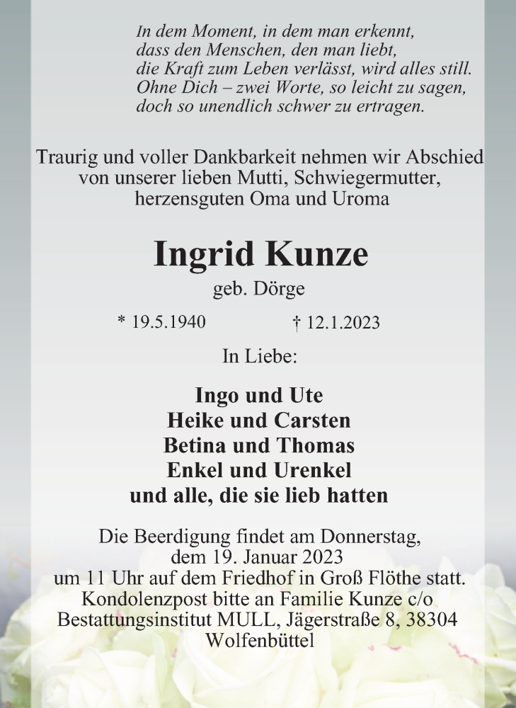 Hier finden Sie alle Traueranzeigen aus der Zeitung, die bisher für Ingrid Kunze erschienen sind. Weitere Traueranzeigen, die in der Zeitung erscheinen, werden hier ebenfalls aufgelistet