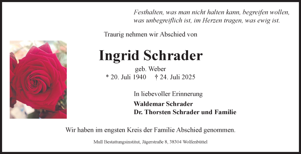 Hier finden Sie alle Traueranzeigen aus der Zeitung, die bisher für Ingrid Schrader erschienen sind. Weitere Traueranzeigen, die in der Zeitung erscheinen, werden hier ebenfalls aufgelistet