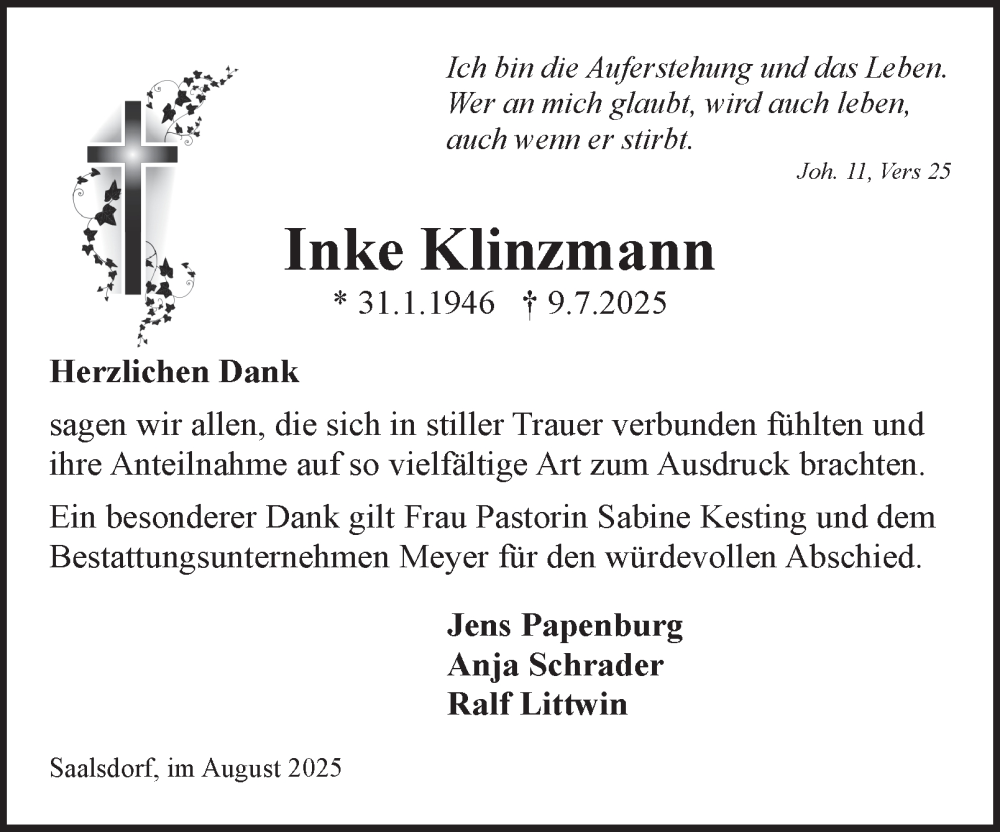 Hier finden Sie alle Traueranzeigen aus der Zeitung, die bisher für Inke Klinzmann erschienen sind. Weitere Traueranzeigen, die in der Zeitung erscheinen, werden hier ebenfalls aufgelistet
