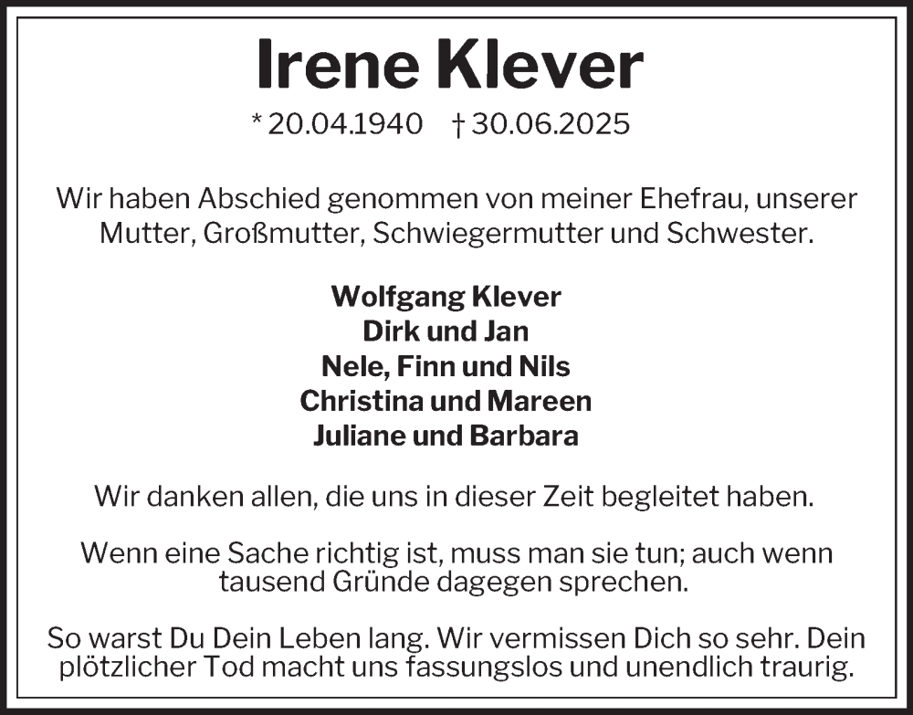 Hier finden Sie alle Traueranzeigen aus der Zeitung, die bisher für Irene Klever erschienen sind. Weitere Traueranzeigen, die in der Zeitung erscheinen, werden hier ebenfalls aufgelistet