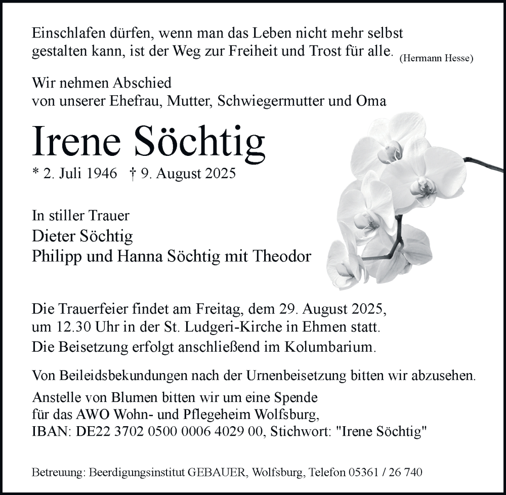Hier finden Sie alle Traueranzeigen aus der Zeitung, die bisher für Irene Söchtig erschienen sind. Weitere Traueranzeigen, die in der Zeitung erscheinen, werden hier ebenfalls aufgelistet