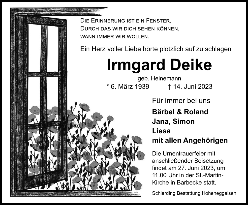 Hier finden Sie alle Traueranzeigen aus der Zeitung, die bisher für Irmgard Deike erschienen sind. Weitere Traueranzeigen, die in der Zeitung erscheinen, werden hier ebenfalls aufgelistet
