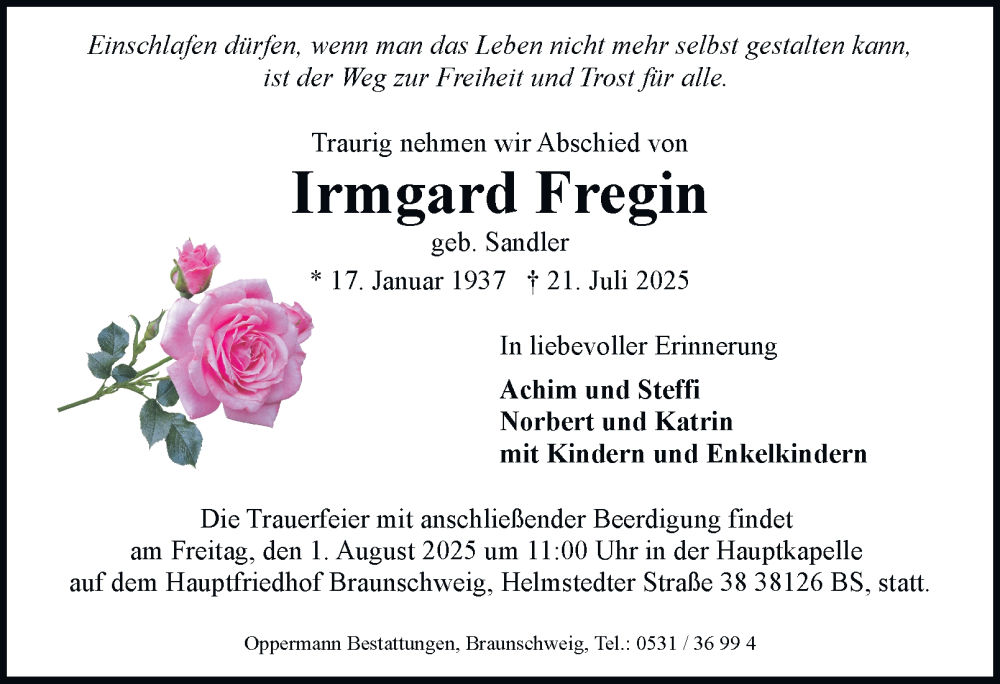 Hier finden Sie alle Traueranzeigen aus der Zeitung, die bisher für Irmgard Fregin erschienen sind. Weitere Traueranzeigen, die in der Zeitung erscheinen, werden hier ebenfalls aufgelistet