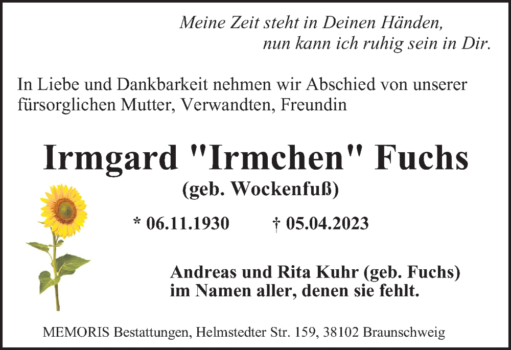 Hier finden Sie alle Traueranzeigen aus der Zeitung, die bisher für Irmgard Fuchs erschienen sind. Weitere Traueranzeigen, die in der Zeitung erscheinen, werden hier ebenfalls aufgelistet