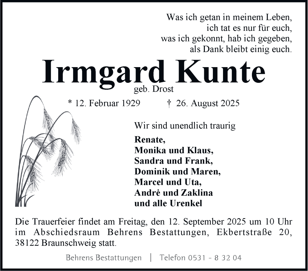 Hier finden Sie alle Traueranzeigen aus der Zeitung, die bisher für Irmgard Kunte erschienen sind. Weitere Traueranzeigen, die in der Zeitung erscheinen, werden hier ebenfalls aufgelistet