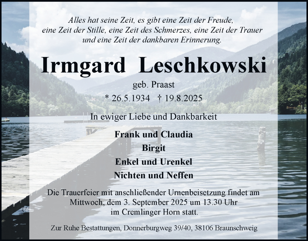Hier finden Sie alle Traueranzeigen aus der Zeitung, die bisher für Irmgard Leschkowski erschienen sind. Weitere Traueranzeigen, die in der Zeitung erscheinen, werden hier ebenfalls aufgelistet