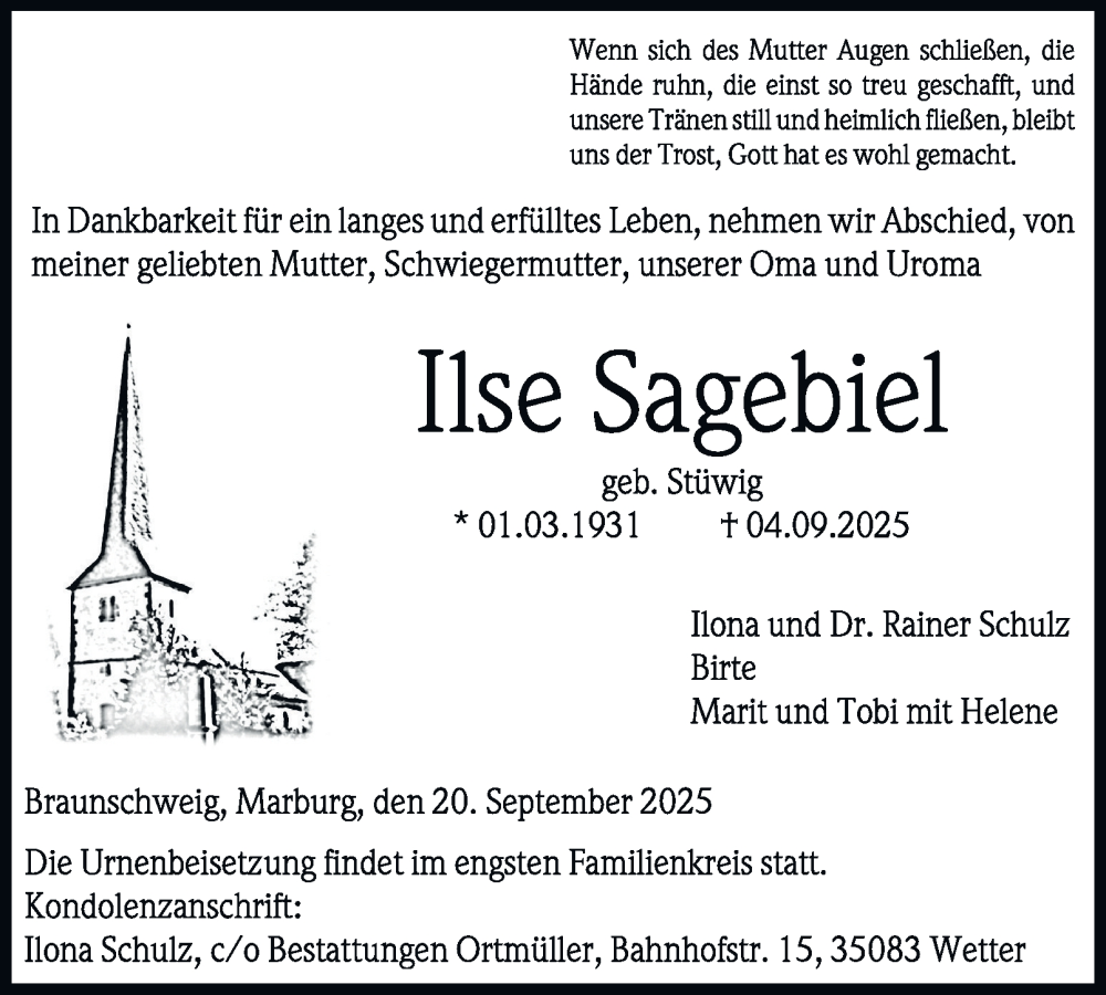 Hier finden Sie alle Traueranzeigen aus der Zeitung, die bisher für Ise Sagebiel erschienen sind. Weitere Traueranzeigen, die in der Zeitung erscheinen, werden hier ebenfalls aufgelistet