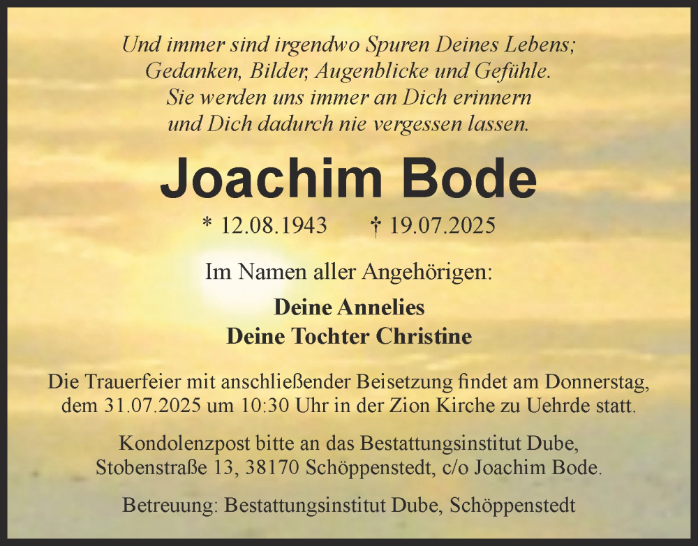 Hier finden Sie alle Traueranzeigen aus der Zeitung, die bisher für Joachim Bode erschienen sind. Weitere Traueranzeigen, die in der Zeitung erscheinen, werden hier ebenfalls aufgelistet