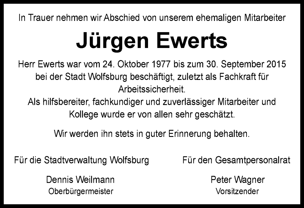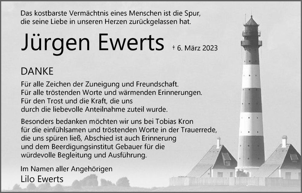 Hier finden Sie alle Traueranzeigen aus der Zeitung, die bisher für Jürgen Ewerts erschienen sind. Weitere Traueranzeigen, die in der Zeitung erscheinen, werden hier ebenfalls aufgelistet