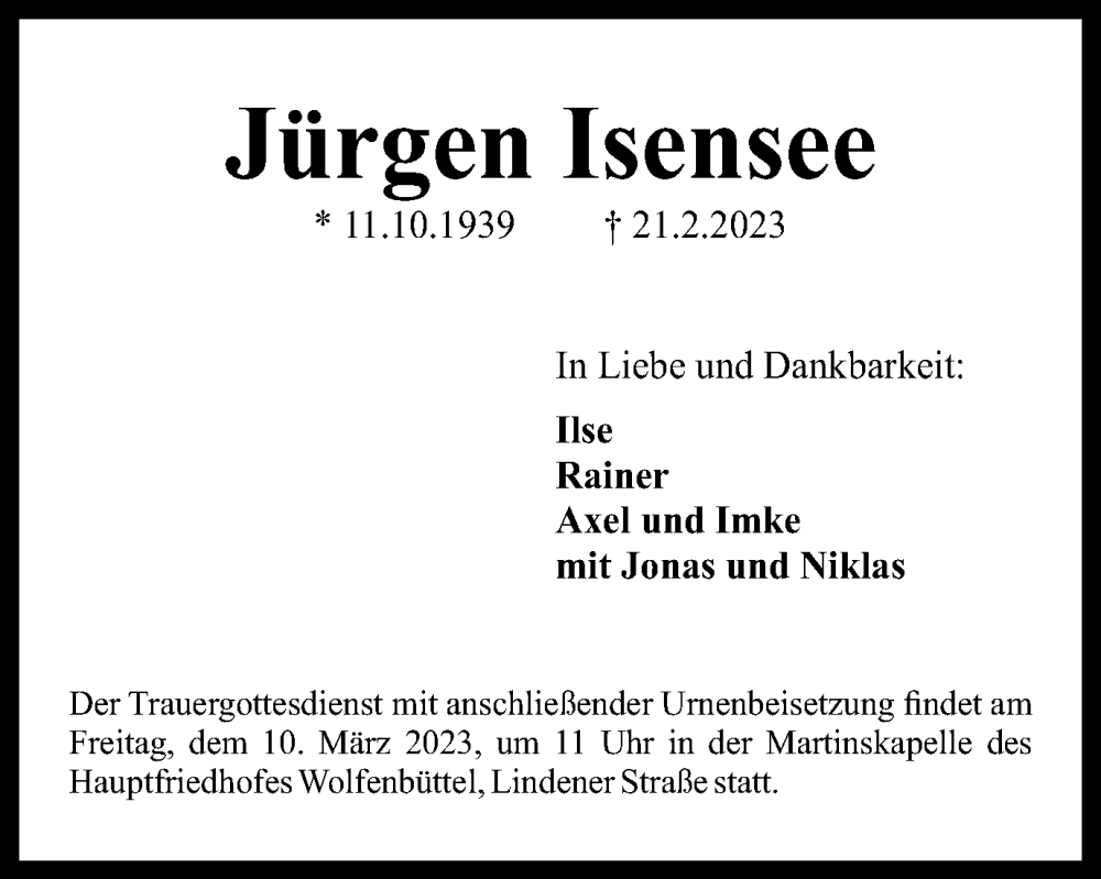 Hier finden Sie alle Traueranzeigen aus der Zeitung, die bisher für Jürgen Isensee erschienen sind. Weitere Traueranzeigen, die in der Zeitung erscheinen, werden hier ebenfalls aufgelistet