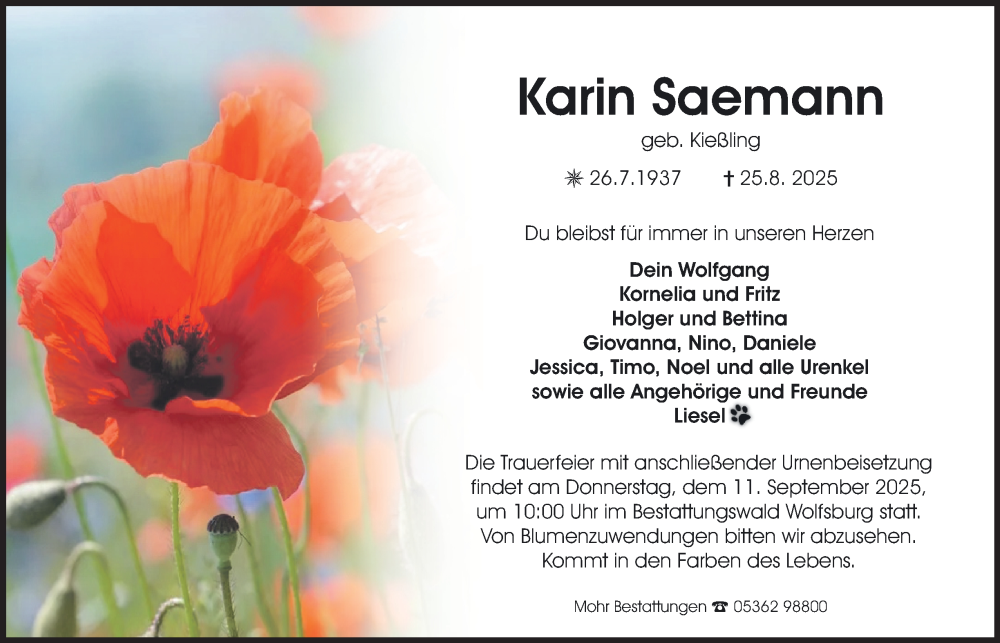 Hier finden Sie alle Traueranzeigen aus der Zeitung, die bisher für Karin Saemann erschienen sind. Weitere Traueranzeigen, die in der Zeitung erscheinen, werden hier ebenfalls aufgelistet