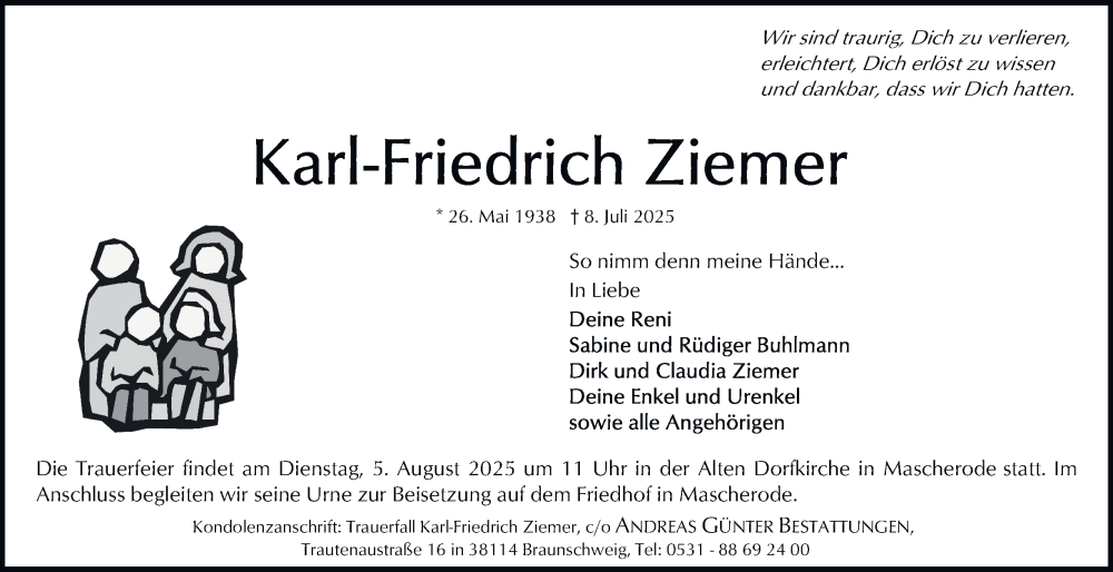 Hier finden Sie alle Traueranzeigen aus der Zeitung, die bisher für Karl-Friedrich Ziemer erschienen sind. Weitere Traueranzeigen, die in der Zeitung erscheinen, werden hier ebenfalls aufgelistet