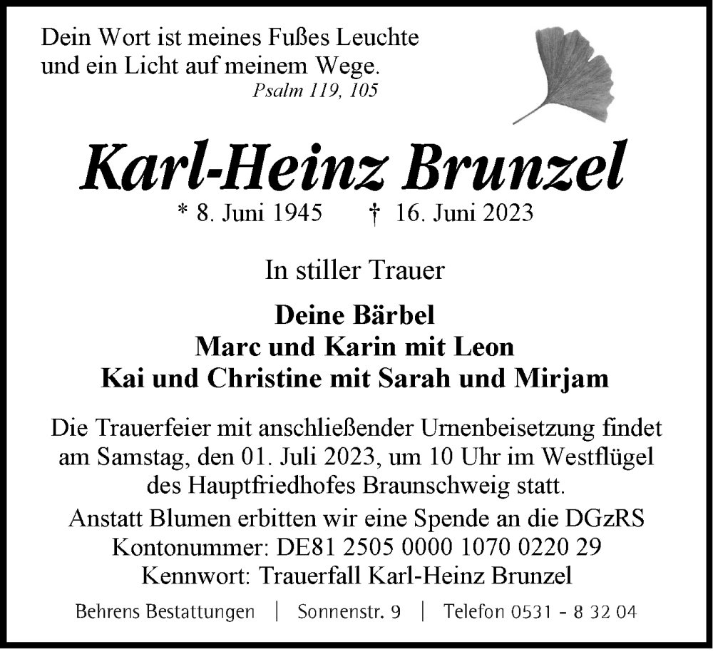Hier finden Sie alle Traueranzeigen aus der Zeitung, die bisher für Karl-Heinz Brunzel erschienen sind. Weitere Traueranzeigen, die in der Zeitung erscheinen, werden hier ebenfalls aufgelistet