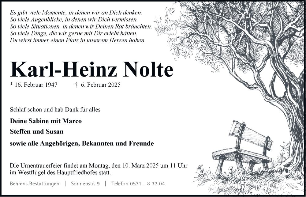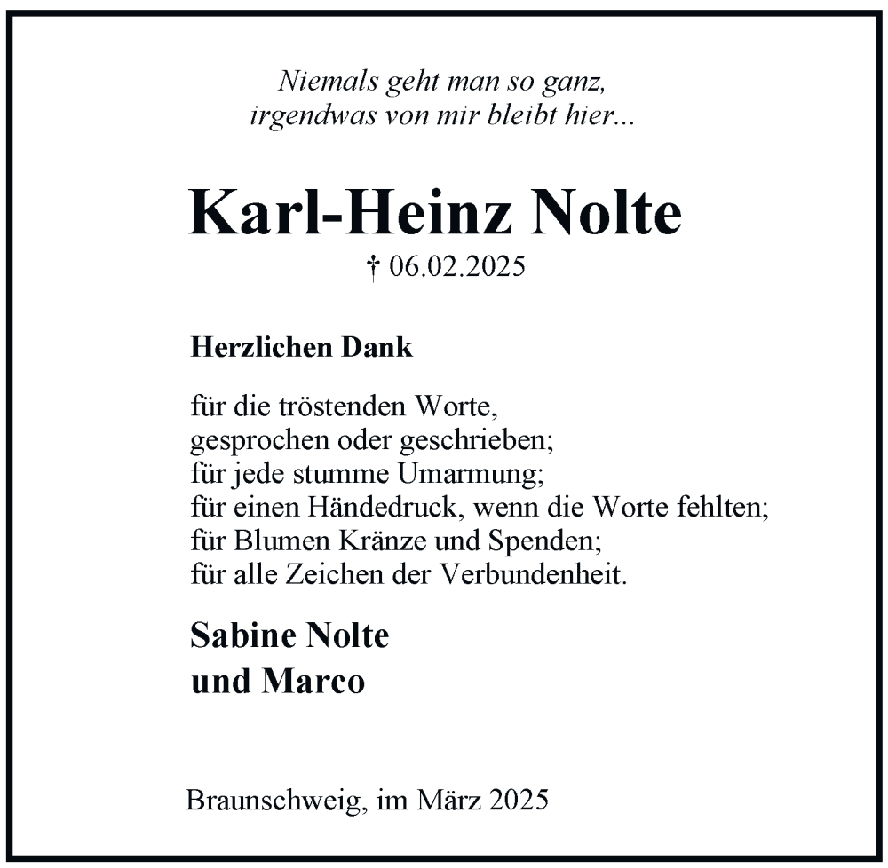 Hier finden Sie alle Traueranzeigen aus der Zeitung, die bisher für Karl-Heinz Nolte erschienen sind. Weitere Traueranzeigen, die in der Zeitung erscheinen, werden hier ebenfalls aufgelistet
