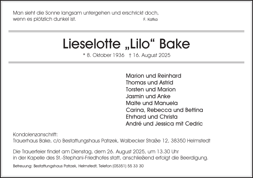 Hier finden Sie alle Traueranzeigen aus der Zeitung, die bisher für Lieselotte Bake erschienen sind. Weitere Traueranzeigen, die in der Zeitung erscheinen, werden hier ebenfalls aufgelistet