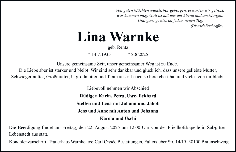 Hier finden Sie alle Traueranzeigen aus der Zeitung, die bisher für Lina Warnke erschienen sind. Weitere Traueranzeigen, die in der Zeitung erscheinen, werden hier ebenfalls aufgelistet