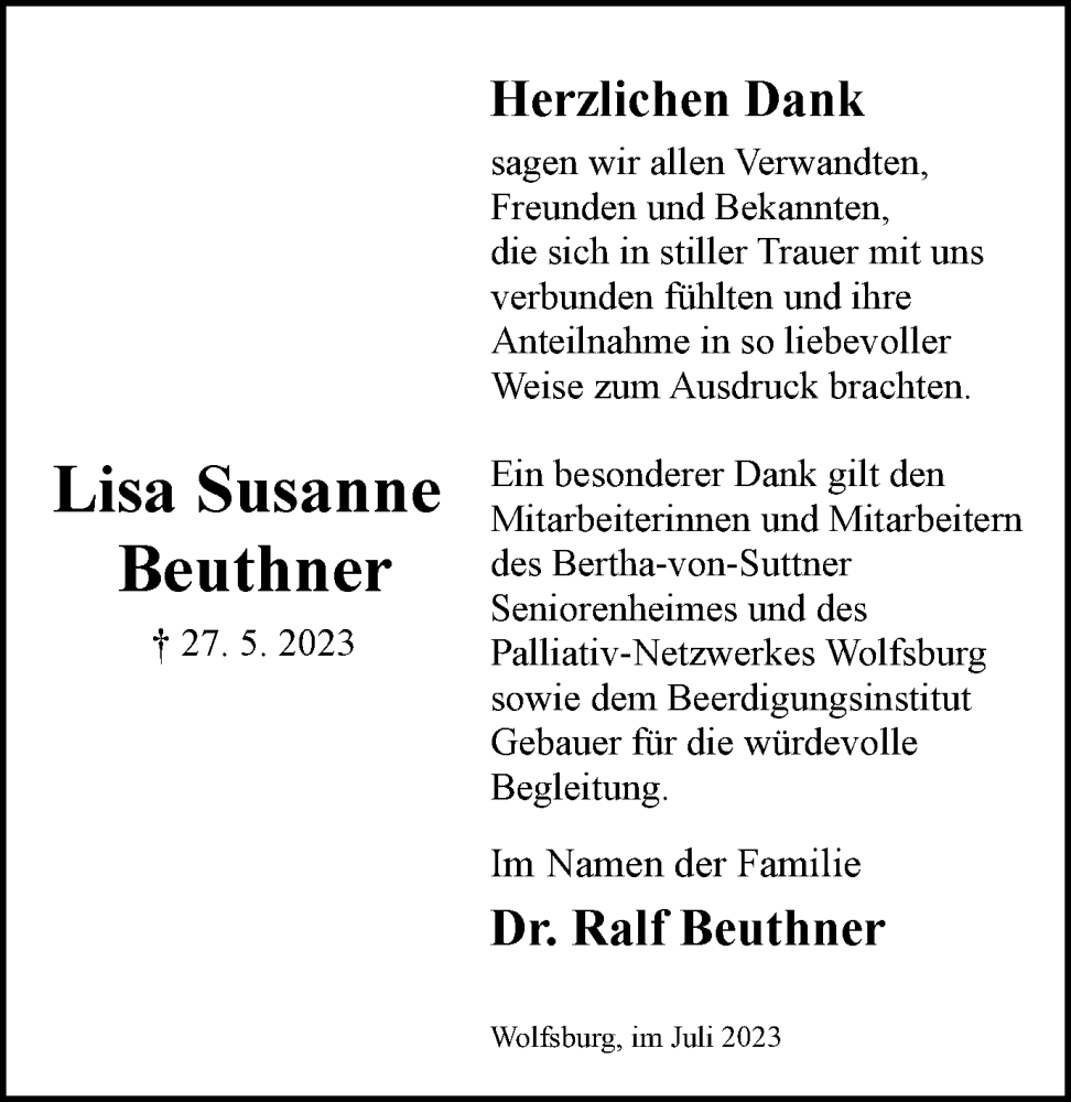 Hier finden Sie alle Traueranzeigen aus der Zeitung, die bisher für Lisa Susanne Beuthner erschienen sind. Weitere Traueranzeigen, die in der Zeitung erscheinen, werden hier ebenfalls aufgelistet