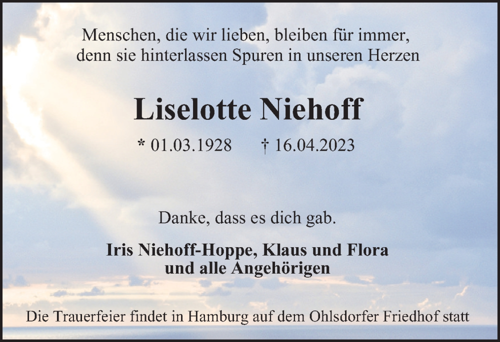 Hier finden Sie alle Traueranzeigen aus der Zeitung, die bisher für Liselotte Niehoff erschienen sind. Weitere Traueranzeigen, die in der Zeitung erscheinen, werden hier ebenfalls aufgelistet