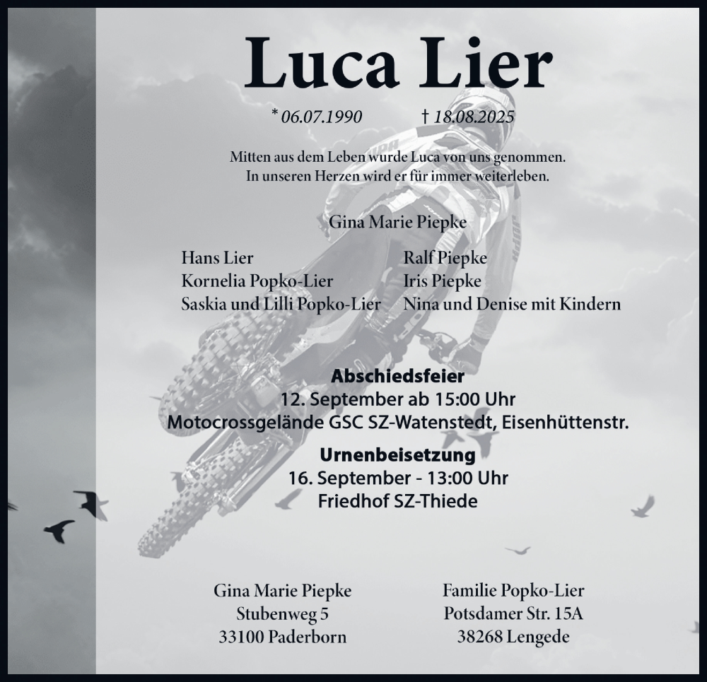 Hier finden Sie alle Traueranzeigen aus der Zeitung, die bisher für Luca Lier erschienen sind. Weitere Traueranzeigen, die in der Zeitung erscheinen, werden hier ebenfalls aufgelistet