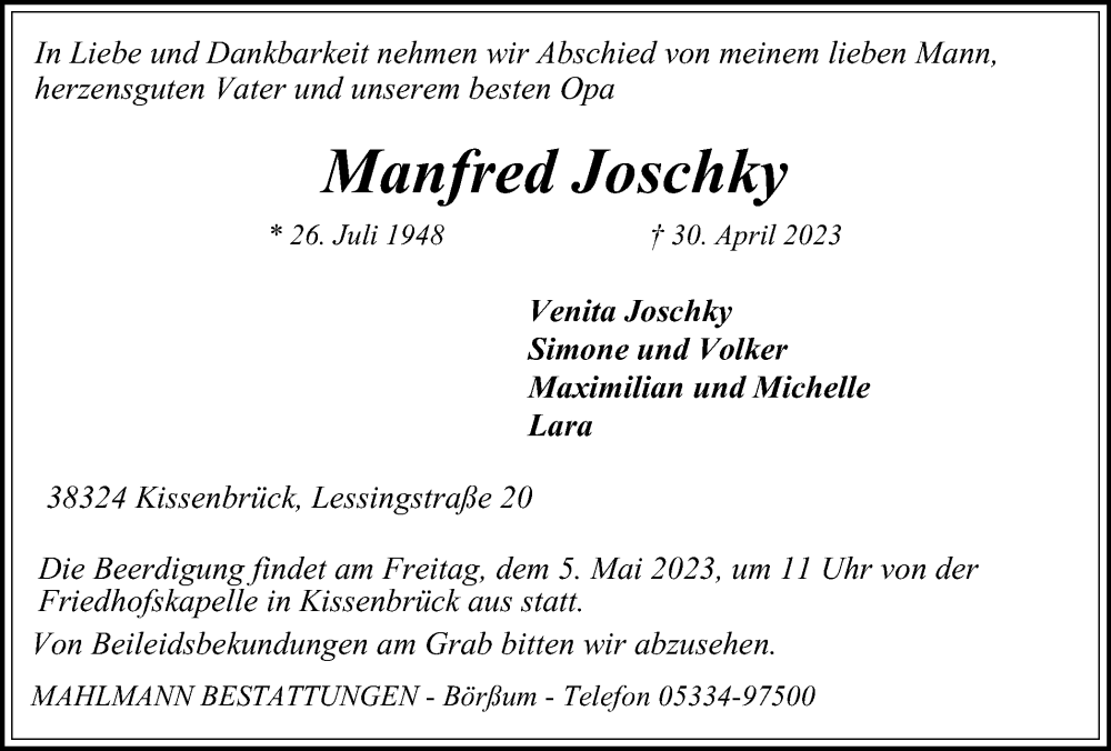 Hier finden Sie alle Traueranzeigen aus der Zeitung, die bisher für Manfred Joschky erschienen sind. Weitere Traueranzeigen, die in der Zeitung erscheinen, werden hier ebenfalls aufgelistet