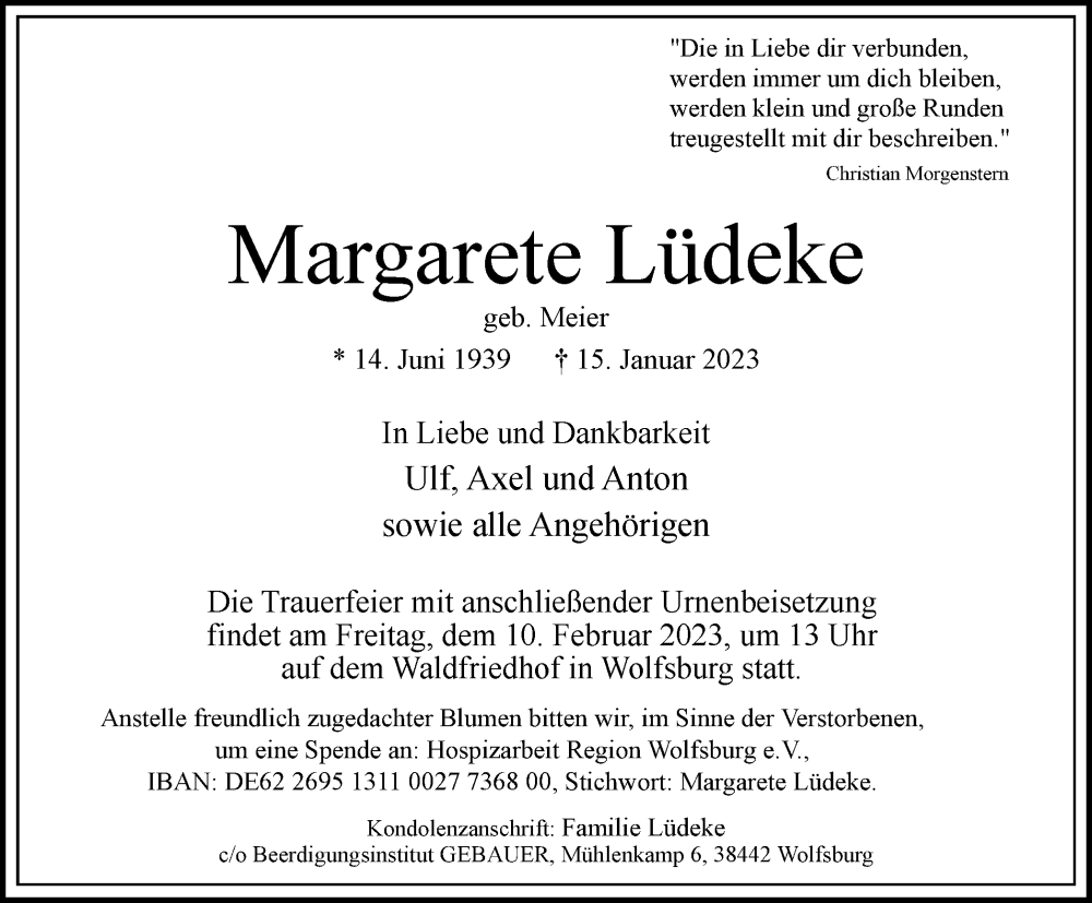 Hier finden Sie alle Traueranzeigen aus der Zeitung, die bisher für Margarete Lüdeke erschienen sind. Weitere Traueranzeigen, die in der Zeitung erscheinen, werden hier ebenfalls aufgelistet