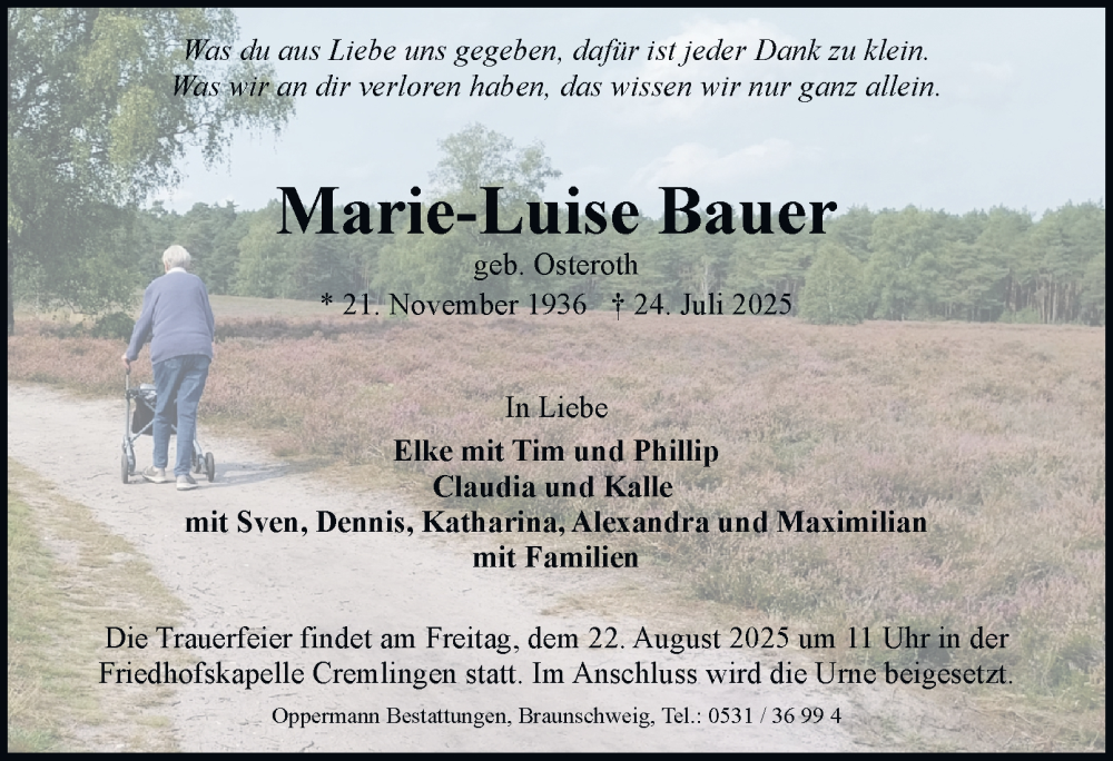 Hier finden Sie alle Traueranzeigen aus der Zeitung, die bisher für Marie-Luise Bauer erschienen sind. Weitere Traueranzeigen, die in der Zeitung erscheinen, werden hier ebenfalls aufgelistet