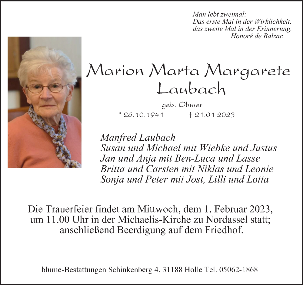 Hier finden Sie alle Traueranzeigen aus der Zeitung, die bisher für Marion Marta Margarete Laubach erschienen sind. Weitere Traueranzeigen, die in der Zeitung erscheinen, werden hier ebenfalls aufgelistet