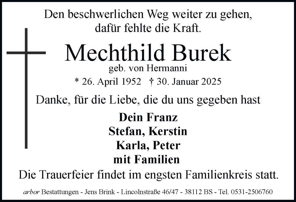 Hier finden Sie alle Traueranzeigen aus der Zeitung, die bisher für Mechthild Burek erschienen sind. Weitere Traueranzeigen, die in der Zeitung erscheinen, werden hier ebenfalls aufgelistet