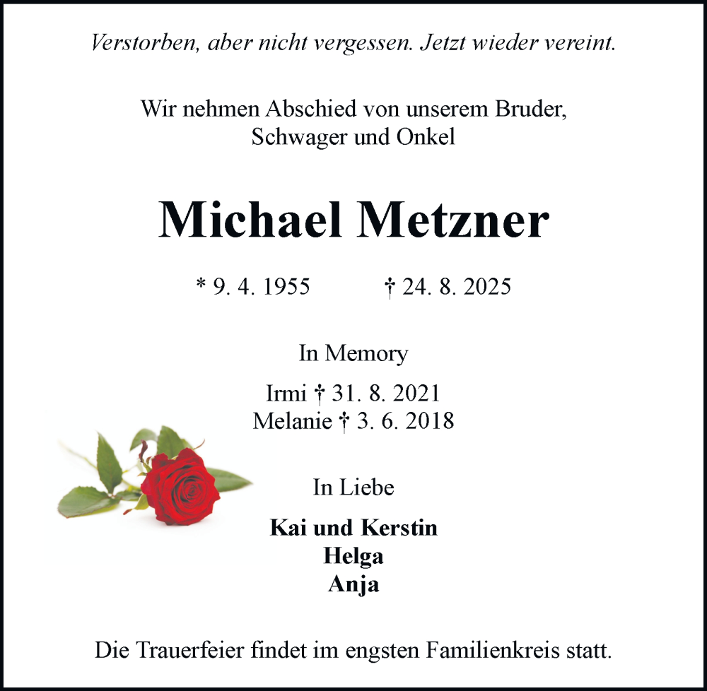 Hier finden Sie alle Traueranzeigen aus der Zeitung, die bisher für Michael Metzner erschienen sind. Weitere Traueranzeigen, die in der Zeitung erscheinen, werden hier ebenfalls aufgelistet