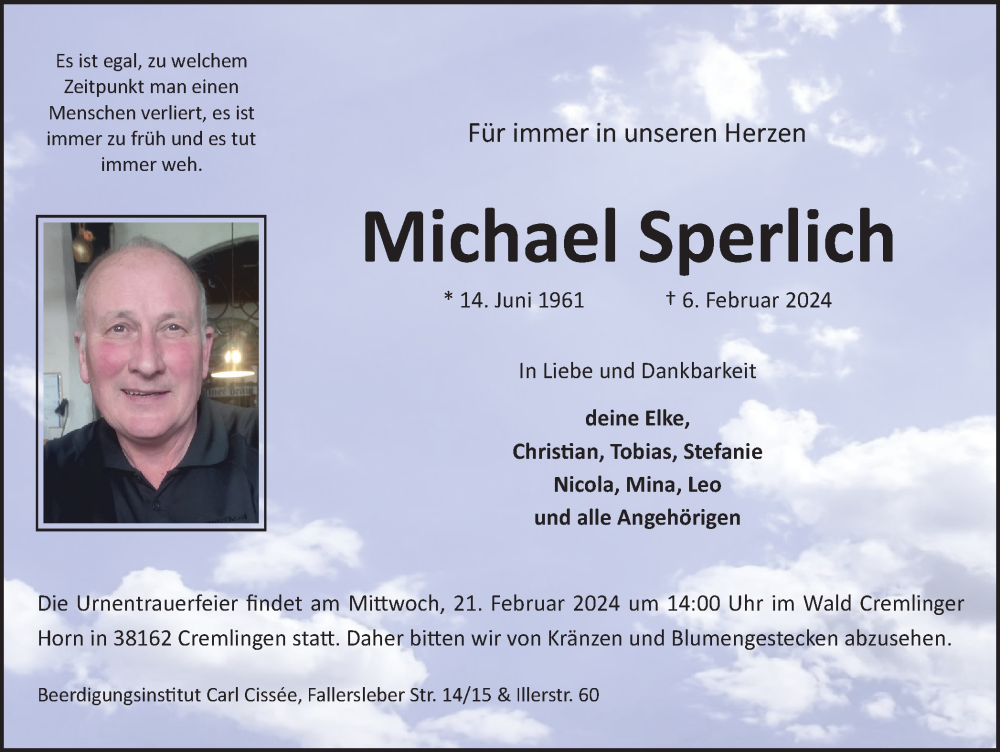 Hier finden Sie alle Traueranzeigen aus der Zeitung, die bisher für Michael Sperlich erschienen sind. Weitere Traueranzeigen, die in der Zeitung erscheinen, werden hier ebenfalls aufgelistet