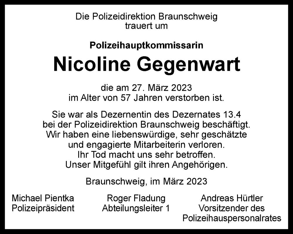 Hier finden Sie alle Traueranzeigen aus der Zeitung, die bisher für Nicoline Gegenwart erschienen sind. Weitere Traueranzeigen, die in der Zeitung erscheinen, werden hier ebenfalls aufgelistet