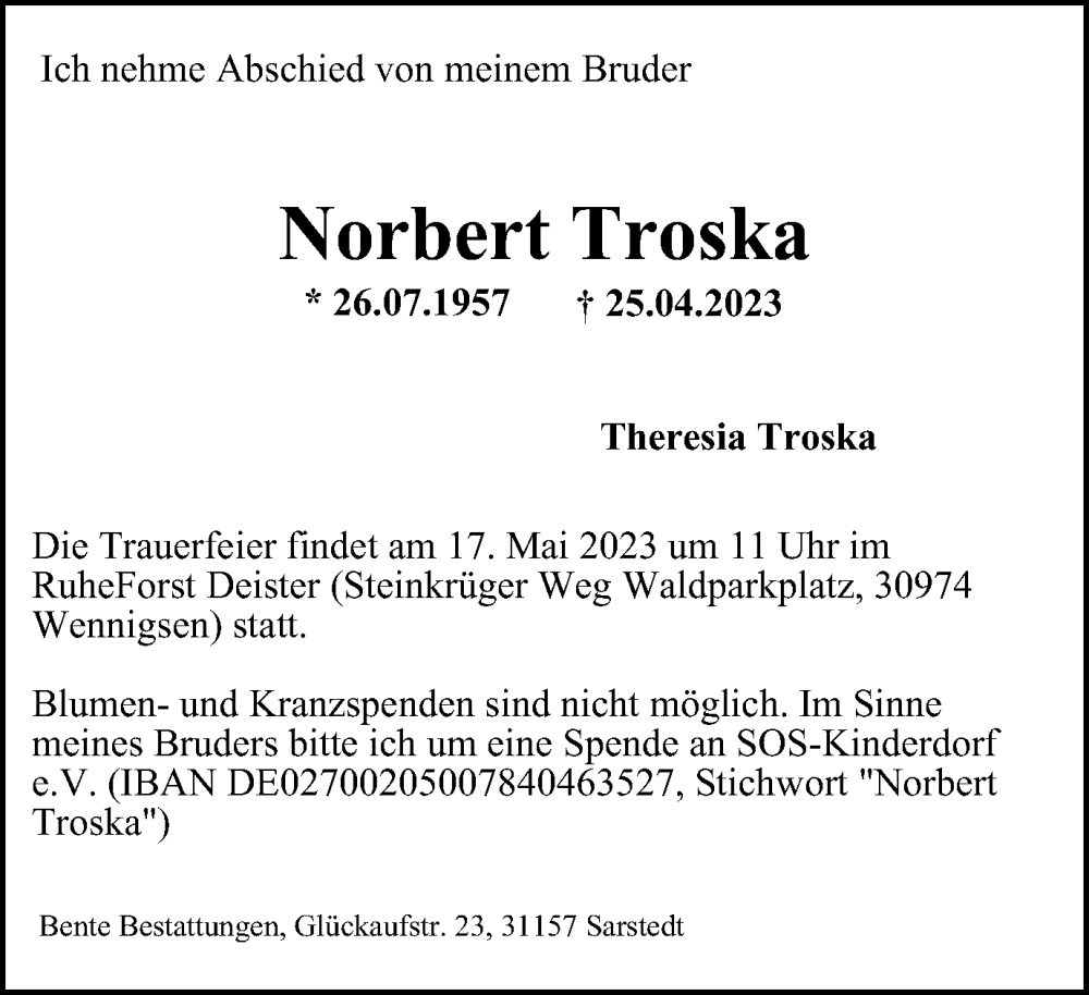 Hier finden Sie alle Traueranzeigen aus der Zeitung, die bisher für Norbert Troska erschienen sind. Weitere Traueranzeigen, die in der Zeitung erscheinen, werden hier ebenfalls aufgelistet