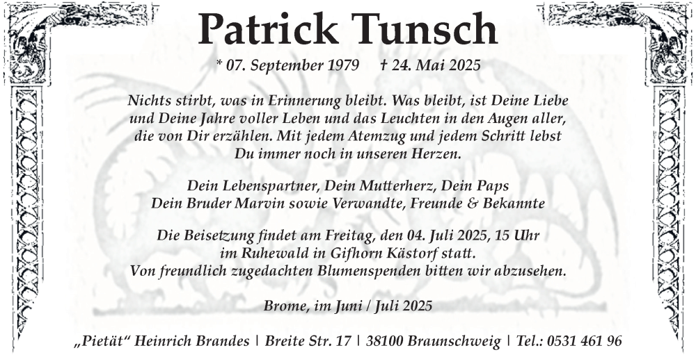 Hier finden Sie alle Traueranzeigen aus der Zeitung, die bisher für Patrick Tunsch erschienen sind. Weitere Traueranzeigen, die in der Zeitung erscheinen, werden hier ebenfalls aufgelistet