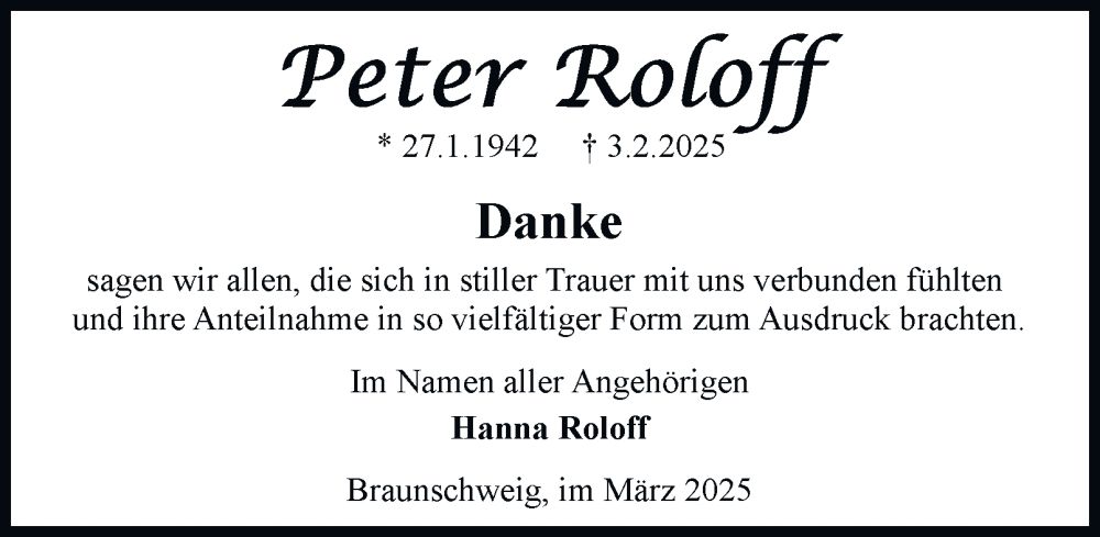Hier finden Sie alle Traueranzeigen aus der Zeitung, die bisher für Peter Roloff erschienen sind. Weitere Traueranzeigen, die in der Zeitung erscheinen, werden hier ebenfalls aufgelistet