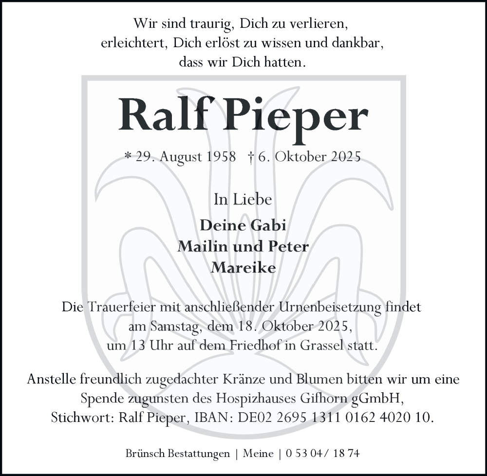 Hier finden Sie alle Traueranzeigen aus der Zeitung, die bisher für Ralf Pieper erschienen sind. Weitere Traueranzeigen, die in der Zeitung erscheinen, werden hier ebenfalls aufgelistet