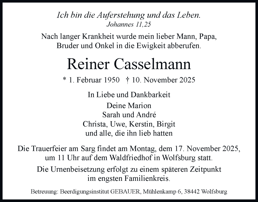 Hier finden Sie alle Traueranzeigen aus der Zeitung, die bisher für Reiner Casselmann erschienen sind. Weitere Traueranzeigen, die in der Zeitung erscheinen, werden hier ebenfalls aufgelistet