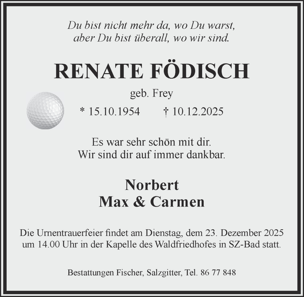 Hier finden Sie alle Traueranzeigen aus der Zeitung, die bisher für Renate Födisch erschienen sind. Weitere Traueranzeigen, die in der Zeitung erscheinen, werden hier ebenfalls aufgelistet