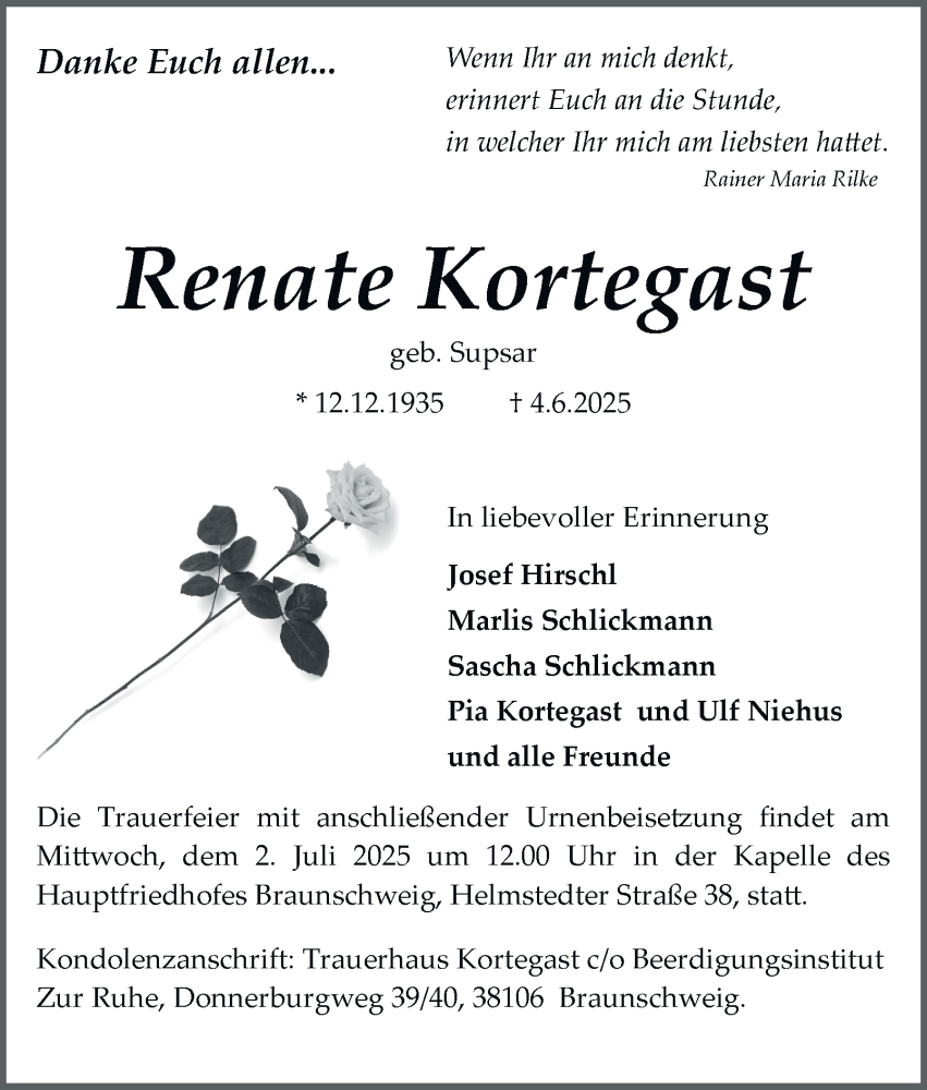 Hier finden Sie alle Traueranzeigen aus der Zeitung, die bisher für Renate Kortegast erschienen sind. Weitere Traueranzeigen, die in der Zeitung erscheinen, werden hier ebenfalls aufgelistet