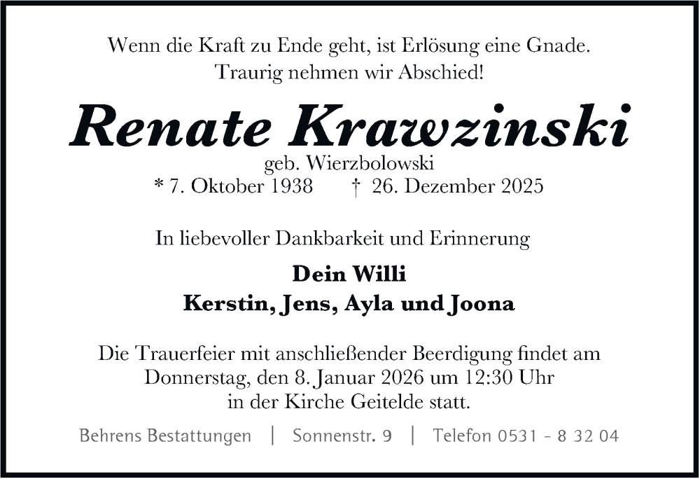 Hier finden Sie alle Traueranzeigen aus der Zeitung, die bisher für Renate Krawzinski erschienen sind. Weitere Traueranzeigen, die in der Zeitung erscheinen, werden hier ebenfalls aufgelistet