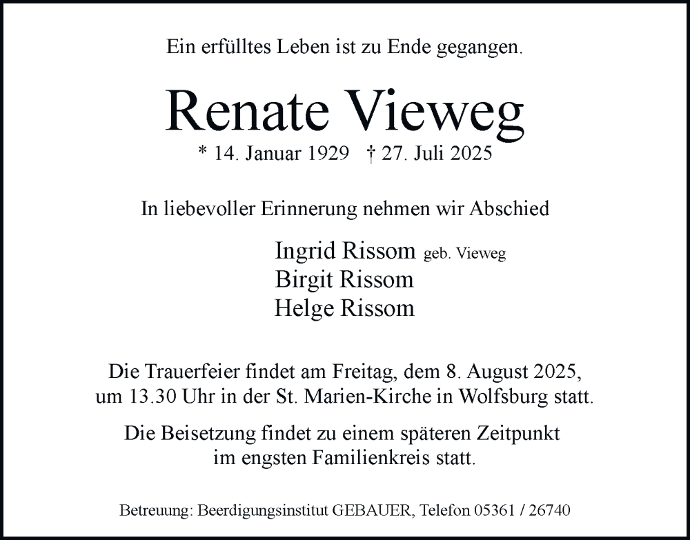 Hier finden Sie alle Traueranzeigen aus der Zeitung, die bisher für Renate Vieweg erschienen sind. Weitere Traueranzeigen, die in der Zeitung erscheinen, werden hier ebenfalls aufgelistet