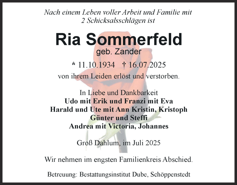 Hier finden Sie alle Traueranzeigen aus der Zeitung, die bisher für Ria Sommerfeld erschienen sind. Weitere Traueranzeigen, die in der Zeitung erscheinen, werden hier ebenfalls aufgelistet