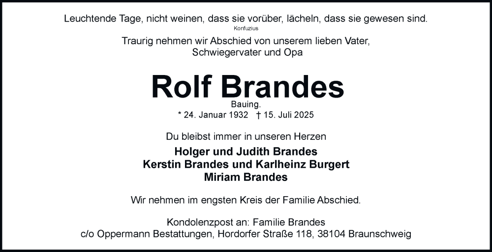 Hier finden Sie alle Traueranzeigen aus der Zeitung, die bisher für Rolf Brandes erschienen sind. Weitere Traueranzeigen, die in der Zeitung erscheinen, werden hier ebenfalls aufgelistet