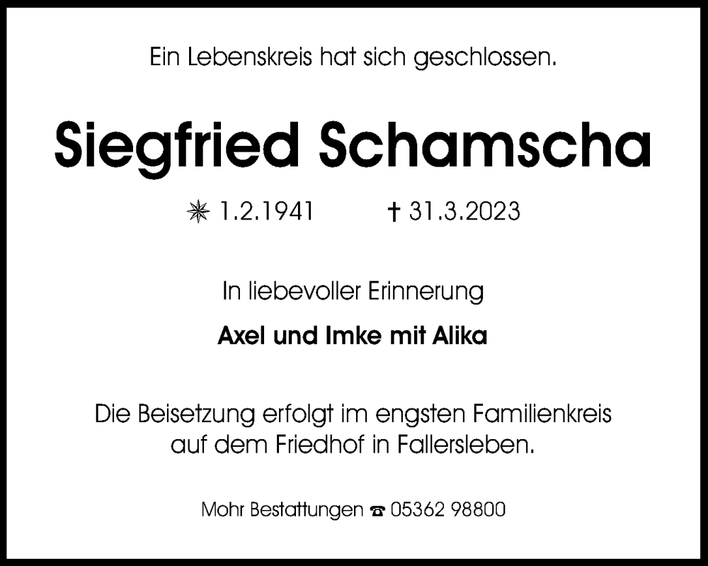 Hier finden Sie alle Traueranzeigen aus der Zeitung, die bisher für Siegfried Schamscha erschienen sind. Weitere Traueranzeigen, die in der Zeitung erscheinen, werden hier ebenfalls aufgelistet