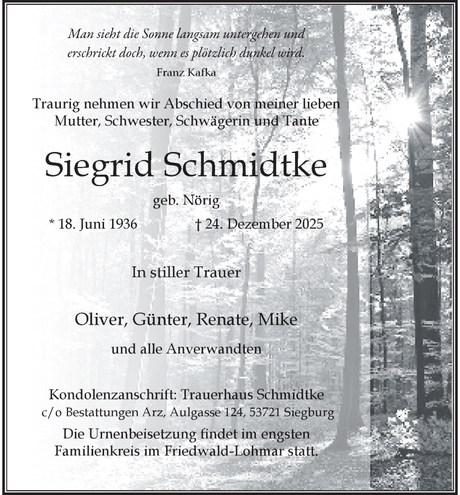 Hier finden Sie alle Traueranzeigen aus der Zeitung, die bisher für Siegrid Schmidtke erschienen sind. Weitere Traueranzeigen, die in der Zeitung erscheinen, werden hier ebenfalls aufgelistet