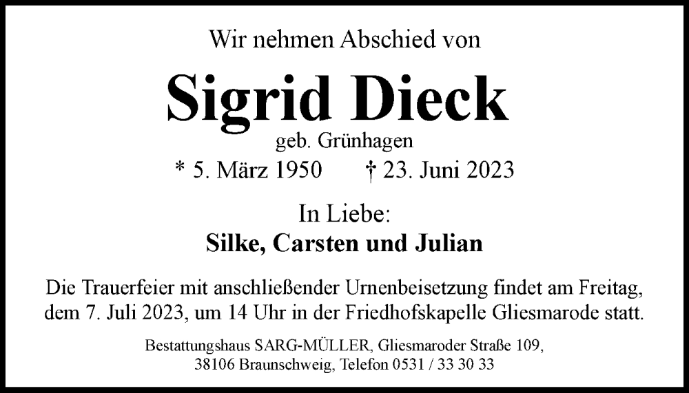 Hier finden Sie alle Traueranzeigen aus der Zeitung, die bisher für Sigrid Dieck erschienen sind. Weitere Traueranzeigen, die in der Zeitung erscheinen, werden hier ebenfalls aufgelistet