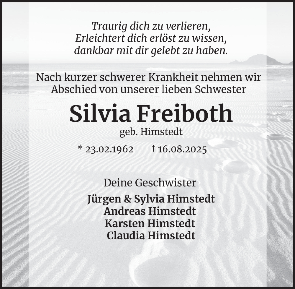 Hier finden Sie alle Traueranzeigen aus der Zeitung, die bisher für Silvia Freiboth erschienen sind. Weitere Traueranzeigen, die in der Zeitung erscheinen, werden hier ebenfalls aufgelistet